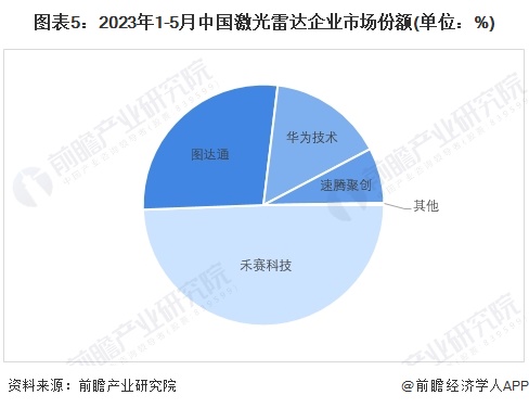 目前国内厂商主要有禾赛科技、图通达、华为技术、速腾聚创,2023年1-5月,上述厂商对应的市场份额分别为49.4%、27.5%、15.4%、7.4%,市场集中度较高。